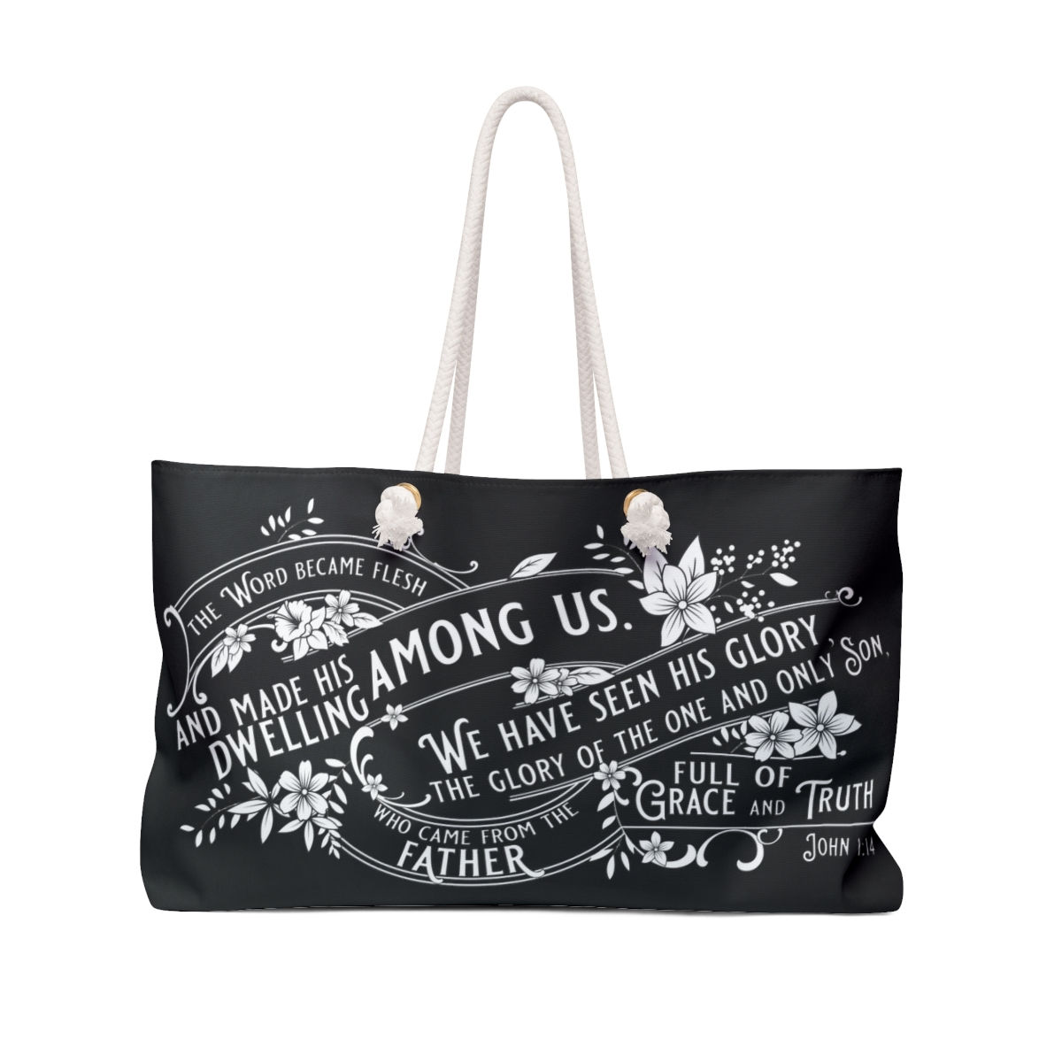 Our oversized Weekender Tote is perfect for your weekend at the beach or in town. The wide-mouthed, durable bag holds a generous amount of personal items and is easily held by its thick rope handles. .: One size: 24" x13" (60.9 cm x 33 cm) .: 100% Spun Polyester .: T-bottom .: Cream sheeting interior lining .: NB! Size tolerance 0.75" (1.9 cm)) .: Assembled in the USA from globally sourced parts